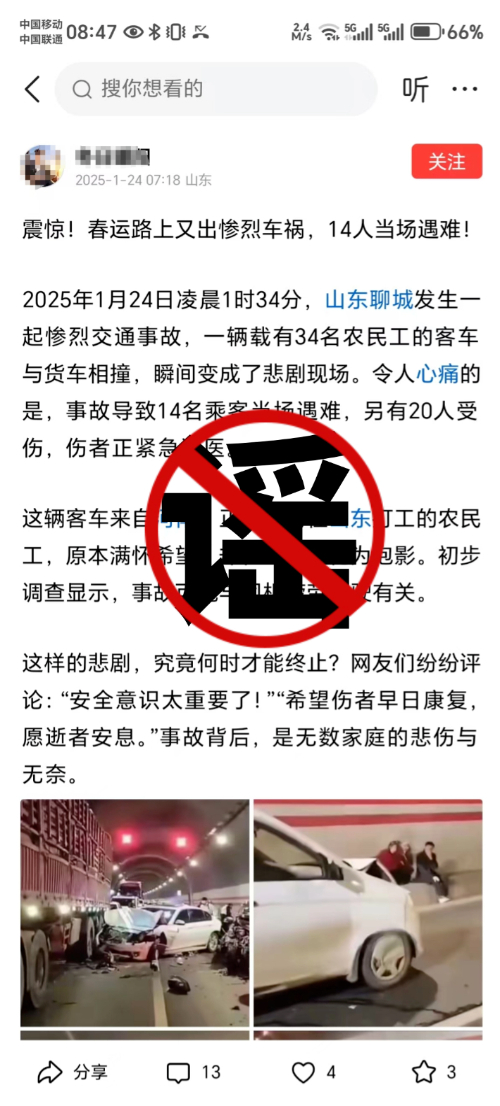 近日,山东聊城警方在网络巡查中发现,两位网民分别在不同的网络平台中发布了一则关于标题为“聊城一隧道内发生多车相撞”的信息,该信息以极具冲击力的描述称,现场多车发生严重碰撞,场面惨烈,群众滞留。信息中还特别提及,一辆满载34名农民工的客车与货车相撞,导致14名乘客当场遇难,20人受伤。